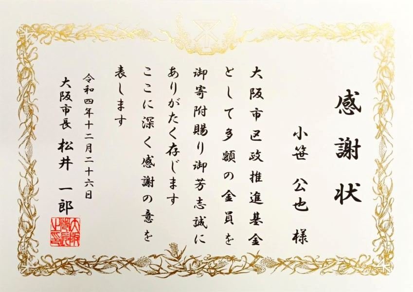 社会貢献への取り組みとして大阪市住吉区の区政推進基金への寄付を行い、感謝状をいただきました。