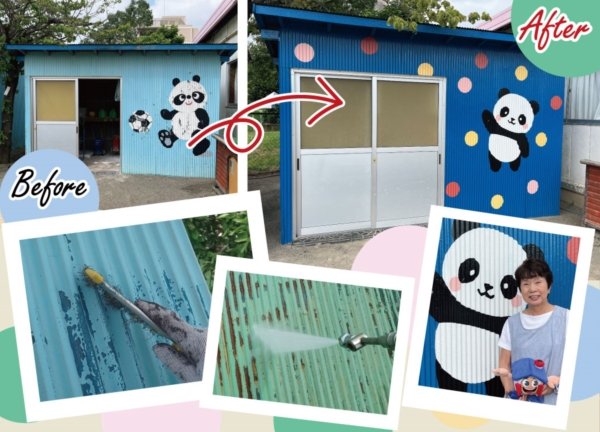 西日の当たる遊具倉庫に描かれている風船とパンダが色あせてきている時期に、思いがけずお話を頂き、塗装
