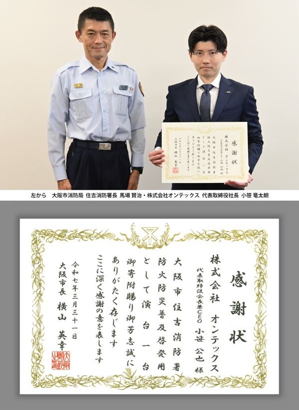 2025.08.12 大阪市住吉消防署から感謝状をいただきました 防火防災普及啓発用として、大阪市住吉消防署へ演台一台を寄贈し、このたび感謝状を賜りました。今後も地域の皆さまのお役に立てるよう、社会貢献活動に取り組んでまいります。