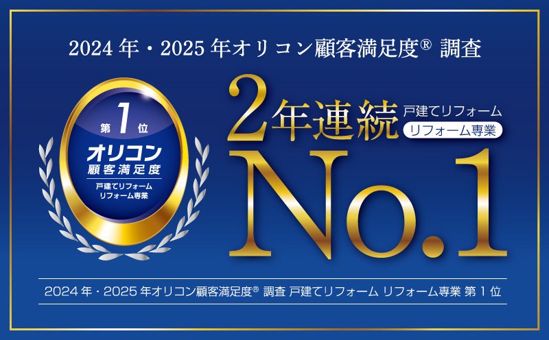 弊社は、このたびオリコン顧客満足度(R)調査において、「戸建てリフォーム リフォーム専業部門」で2年連続となる第1位を受賞いたしました。