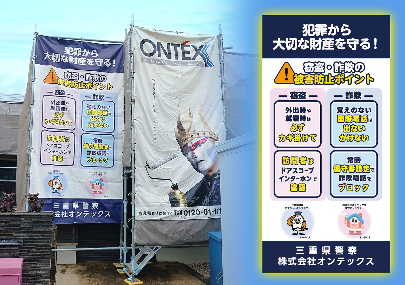 弊社はCSR活動の一環として、特殊詐欺の防止を呼びかける養生シートを三重県内で施工する塗装工事現場の足場に順次設置しています。